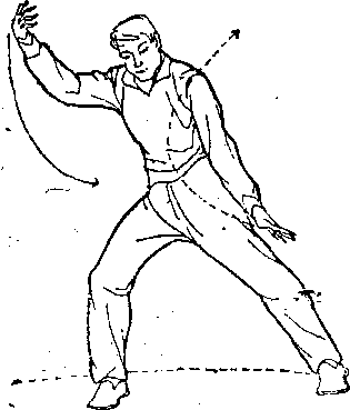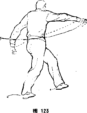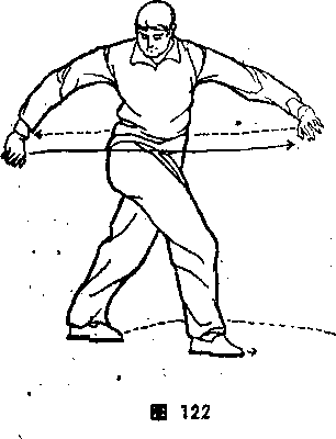 旋,从右小臂狩钻打出,转腕撑按,左掌心向东。两臂微低于 肩,形成弓状,扭腰开肩。体面向南,目视右手(图122)。③左 脚向东上步,左腿屈膝,微带右脚檫地相随,右腿蹬直,脚跟微 向外撑,成左弓步。词时,左掌外旋翻转,左掌心向上,接着肘