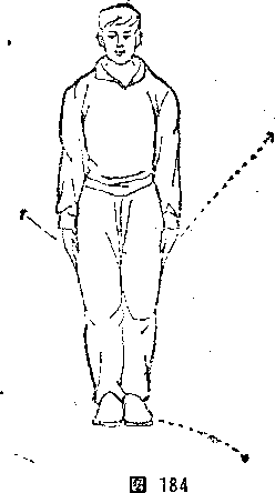 ①预备势。面南而站,两脚并立,两钌下垂,目视前方(图 84)。②左脚向东横跨,左胸尖外摆。同时,两臂分别向躍侧外