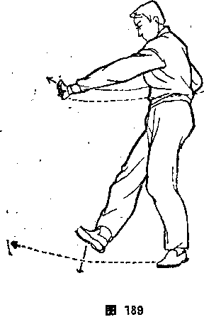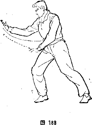 方(图187)。三穿并非只限于穿三下,也不一定非强调走一步穿 一下不可,也可以一步两穿或两步三穿。实际上穿手快于行步, 按照顺时针方向,随意圈走。⑤右脚向西上步,右腿屈膝,左脚 蹬直,成右弓步。同时,右掌向怀里收,掌心向下,右腕微吊, 接着右掌外旋翻腕,从左臂上向前甩出,掌心向上,与眼平高 : 左掌向右平划回捋,掌心向下,左臂贴胸靠肋。挺腰发劲。体面 向西,目视西方(图188)。⑥身向后坐,右脚微挑,脚尖上勾。 同时,右掌下沉回卷变拳抱肋,拳心向上;左掌变拳向前横伸微 低于肩,拳心向下,拳眼向内。体面向西,目视西方(图189)。 ⑦右脚向西落地,左脚擦地向西勾挑,脚尖翘起,微向外拧。、左 拳外旋回卷,贴腰后拉,.内旋转腕,拳心向后;右拳内旋转腕用 拳背向前崩弹,拳心向前,两臂直伸如弓,微低于肩。拧腰坐 胯。体面向西,目视西南(图190)。⑧左脚向西落地,右脚擦地 向西勾挑。右拳外旋回卷,贴腰后拉,内旋转腕,拳心洵后;左
