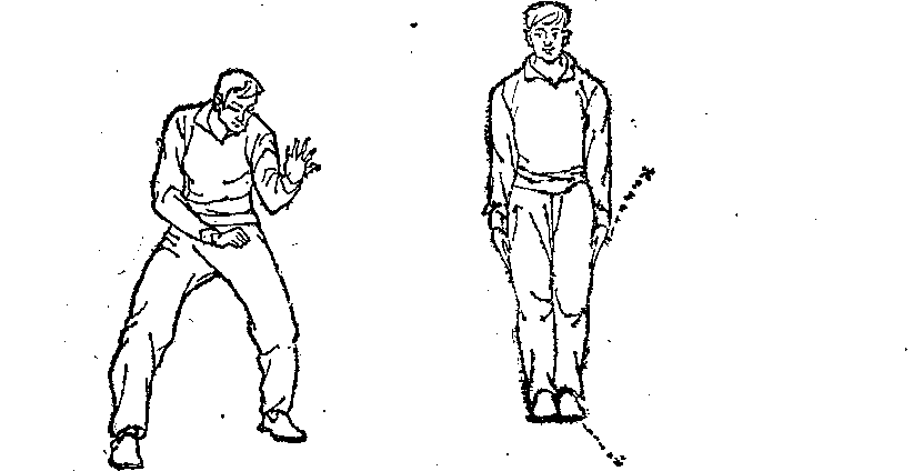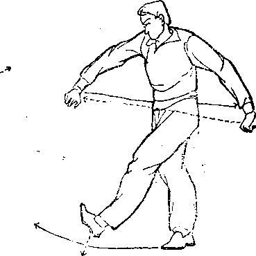 (1)两腿自克——①面东而站,两脚并立,两手叉腰。左 脚向东上步(图215),右脚用脚脖磕左脚跟,催左脚向前滑动 (图216)。②右脚向东上步,左脚用脚脖磕右脚跟,催右脚向前 滑动。左脚上步右脚磕,右脚上步左脚磕,反复无穷。…