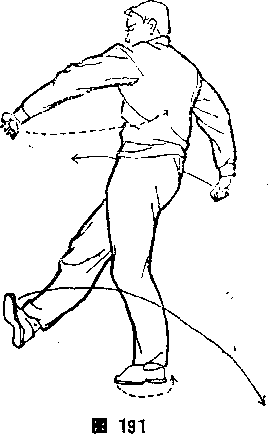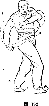 腿前向东南套迈落地;左臂微收,布臂微屈內旋,拳心向上体 而向东南,目视东南(图192)。右脚里扣,左脚掌碾地,体向 左转,左脚向西擦地勾挑3同时,右拳随休转用拳背向西崩弹,,
