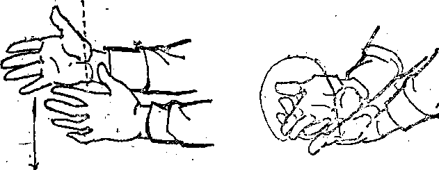 滚压式练法:①右掌放在左掌上,两掌心向上(图196)。②
