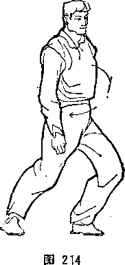 (3)水中游虾——这是弓身的练法。两脚前后而立,先弓 身后坐,重心后移〈图213),再挺身前探,重心前移(图214)。