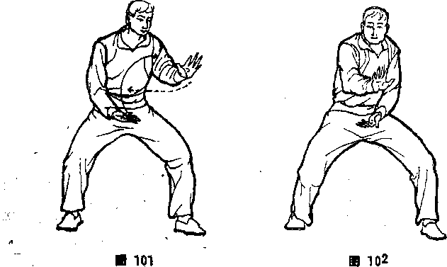 (1>死步顺手摘——初学五子拳的人,必须按照此种方法练 习。①马步蹲好,左手前伸,与肩平高,左掌心斜向下,左臂似 直非直;右臂抱肋,右掌心向上(图101)。②右手顺心口方向, 从左手上拧钻打出,掌心斜向下,指尖微向上抬;同时左手微向 上引,然后反掌卷回,左肘靠左肋,左掌心向上,要扭腰顺肩相 助。两手交替打出卷回,周而复始,往返无穷(图102)。