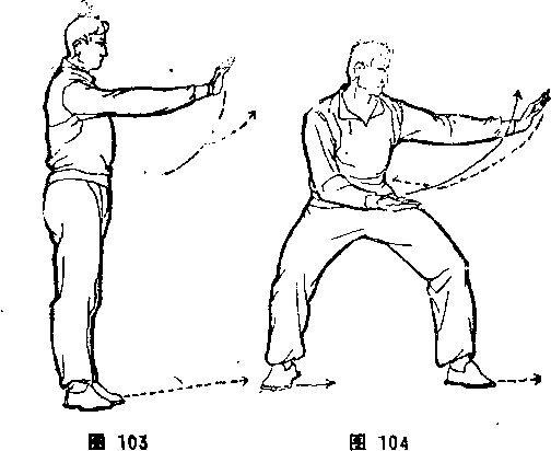 左弓步。同时,左掌撖向上引,然后外旋翻转,屈臂回卷靠肋 若拿内旋, 从左小脊上拧转打出,右臂似直非直,与肩平高,右 掌心斜下,抒膜顺肩。体面向东,目视前方(图105)。④马步顺 手摘。同本节②(图106 )。两种步型顺手摘交替进行,一直打到