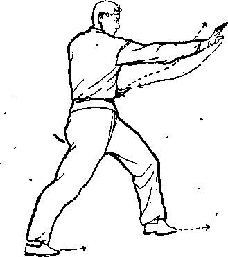 对心口,贴腰回卷后拉,拉到左臂伸直再内旋翻腕,左掌心向 后而右掌收腕,从左臂上拧钴打出,转腕撑按,右掌心向前。 两臂微低于肩,形成弓状,扭腰开肩。体面向北,目视左手(图 123)。左右交替打出卷回裔拉,一直打到场地尽头处在赶到 右掌前穿时,再变势回打。④右脚微抬,向西撤步,滑带左脚, 体向右转,两腿屈膝,成马步。同时,右掌外旋翻转,掌心向