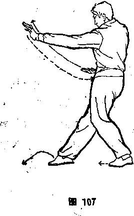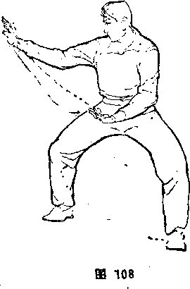 迹尽头处,做到马步顺手摘时可以变势,回身苒打。⑤坐步颇 手摘。体向右转90度,左脚微抬,向东落地,左腿微屈;右脚向 东微拉一小步,右腿斜伸,成左坐步。同时,右掌于胸前由上向 西翻转盖出,再屈臂回卷靠肋,右掌心向上;左掌屈臂回收,从 右小臂上拧钴打出,左臂似直非直,与肩平高,左掌心斜向下。 体面向西,目视西方(图107)。⑥马步顺手摘。同本节②,但方 向相反(图108)。⑦弓步顺手摘。同本节③,但方向相反(图