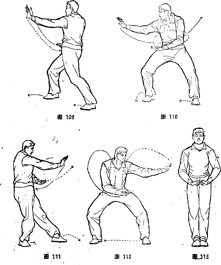 1:09)。⑧马步顺手摘。同本节②,但方向相反(图110)。⑨坐 步颟手摘。周本节⑤,但方向相反(图111 )。?马步顺手摘。同 ? 本节②(图112)。?收势。左脚向右胸并拿,两腿直立。同时, 右拿向西卷拉,接着两手由两侧上举托天,再经胸剪直而下捋至 肢前。体面向南,目视前方(图113 )。