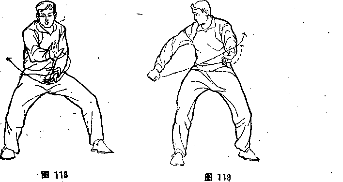 掌心斜向下,右似直非直;左臂抱肋,左掌心向上(图118)。