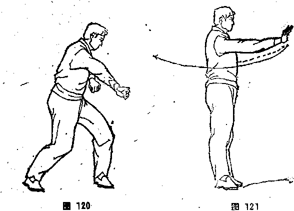 对心口,贴腰回卷后拉,拉到左臂伸直,再内旋翻腕,左掌心向 后,右掌收腕,从左小臂上内旋拧钻打出,打到右臂伸直,转腕 撑按,右掌心向前。两臂微低于肩,形成弓状,拧腰开肩。目视 左手(图120)。左右可交替打出卷回。
