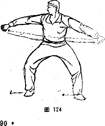 上,接着回卷屛拉,内旋转 腕,掌心向西;左掌收腕, 从右小臂上拧钻打出,转腕 撑按,掌心向东。两臀微低 于肩,洼腹吸胸,提肛吊 顶。体面向南,目视正西 (图124)。⑤上右穿掌。 同本节②,但方向相反(见 图22)。⑥上左脚穿掌同