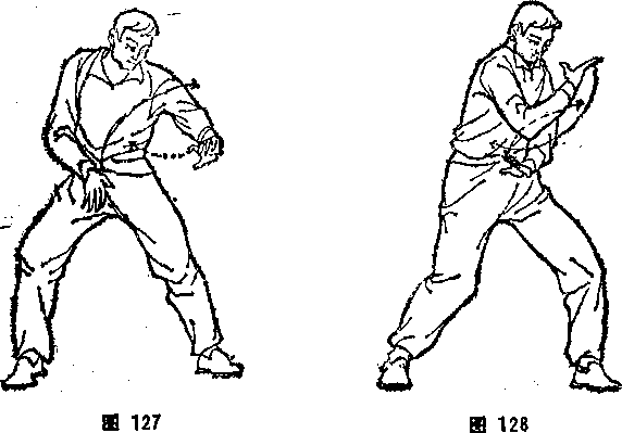 本节③,但方向相反(见图123)。⑦上右牌穿掌。同本节②,但 方向相反(见图122)。⑧马步穿掌。同本节④,但左右相反(图