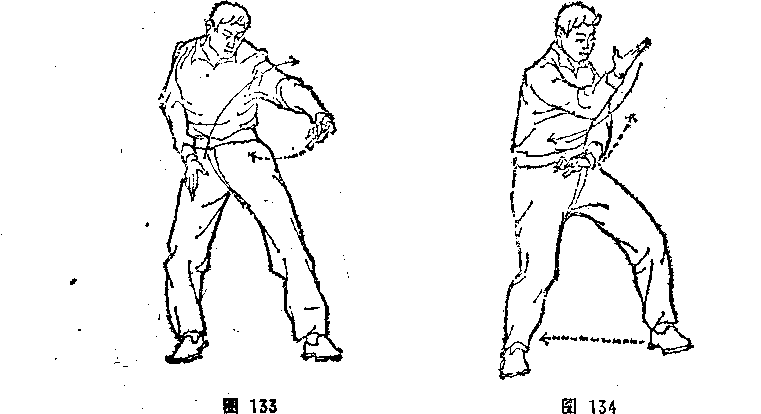 133〉。③右掌外旋翻掌转腕,从左臂上顺心口方向向前甩出,与 眼平高,右掌心向上;左掌捋至腹前,左掌心向下。目视右掌 (图134)。④左脚撤回,.两脚并立。右掌屈臂由左臂上卷至腹前