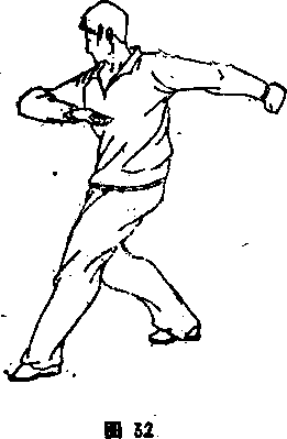 1. 拧身:绳子是用无数根单线拧成的,评价绳子的好坏,要 看它的拧劲大小和均勻程度如何。在拧动限度的情况下,拧 劲越大,绳子鉍结实耐用。五子拳的拧身动作就现了这种拧 劲。拧身是上身和下身转动的方向相反,或者肩和腿的转动方向 相同,而腹部转动的方向相反。如图32所示,右肩左拧前顺,而 左腿右拧前顺,很明显地出现了拧劲。拧身的好处是能把全身的 散劲,拧成一个整劲,这要比散劲大好多蓓(图32 )。
