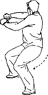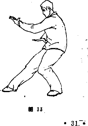 2. 弓身在练拳时,依靠吸胸收腹,腰部后鼓,使身躯形如 弓状,故而叫做弓身。像狸猫蹬树一样,首先伏身弓腰,然后纵 出(图33)弓身的作用有两点 —是可以蓄劲,二是引进落 空当对方朝我腹部打来,可坐步吸胸,使之落空或使其力成为 强弩之末同时也把自己周身之气集中起来,自然形成蓄劲,紧