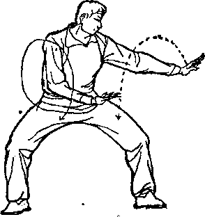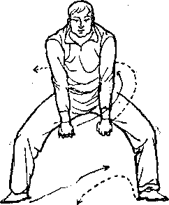 双掌变拳,左拳外旋向怀里横滚平挪,然后两拳分别向两脚 外拉上举,再向前下栽于腹前下方,两拳心向里,拳面向下,拳眼相对。马步不变。体面向南,目视前下(图236) 235 图 23
