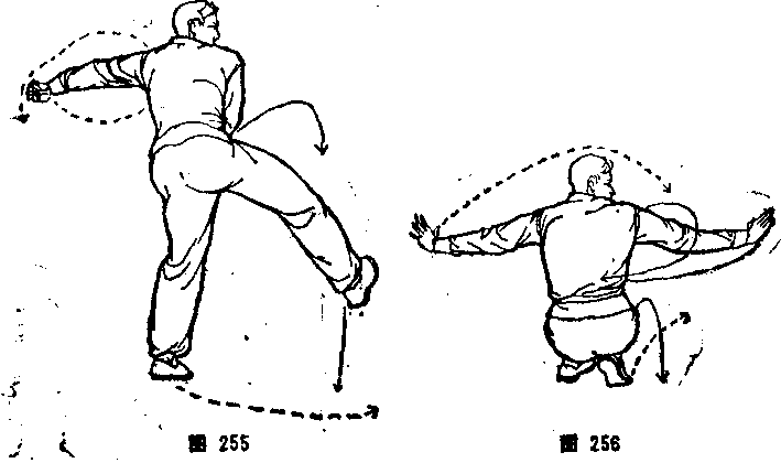 右脚下落,脚尖向北,左脚向右脚后插步,两腿交叉屈膝下鳟,右脚全脚着地,左脚跟提起,成歇步。在右脚下落左脚插的 同时,左臂屈肘回收,两臂于腹前斜下相交,右外左里,两拳变 掌,掌心向里。成歇步的同时,两臂交叉向上过头后,分别向两 侧抖颤下劈掌,与肩平高,两掌心向前,指尖斜向上。体面向 4匕,目视前方(图256