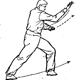 图258 图258 ①右脚向挑踢。同时,右掌变拳于胸前缠卷后拉,拳 心向上,右臂屈射胸靠肋,左拳变掌从右臂下外旋拧钴打出,掌 指向左下,掌心向前,杳肩腆腕(图259 )。②右脚落地,左脚 并以脚类点地,成左虚步。同时,左臂外旋屈肘,,向怀里搂肘带 :上步手,缠卷后拉,再内旋后伸,成钩手,钩央向右厂翁臂内旋 后拉,外旋向怀里搂,再向前阴掌打出,掌心向下,掌指微向左 横,右臂与肩乎高,如,似直。体面向东,目视前方(图邡0)。