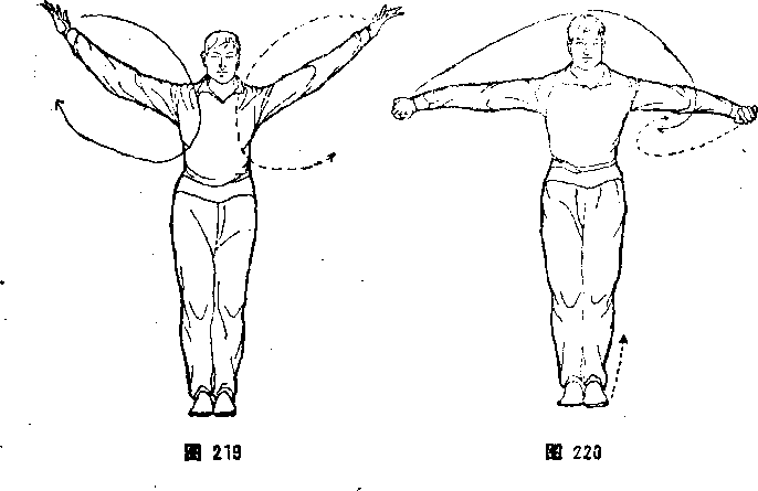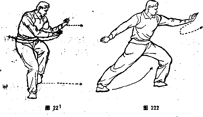 ① 左臂由下外旋曲肘,左拳心向上,右拳臂外旋经上向左顴: 砸,拳心向上。体向左转,左腿屈膝提起,右腿屈膝微(图221>。 ②两拳变掌,左掌从右臂上内旋拧钻而出,左臂如弯似直,左手 成柱子手,右寧貼胸回卷后拉成钩手,钩尖向左。左脚向前上二 步,左瓶、曲膝,右腿蹬直,成左弓步。拧腹扣裆,扭腰颍肩,全、 身形成劲。体面向东南,目视前方(图222 >。