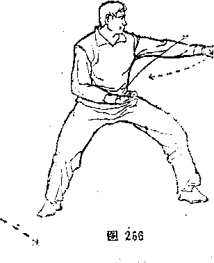 体向左转,右腿绷直,左腿屈膝,成左弓步。左臂屈肘外旋 拧转回拉,左大臂靠肋,拳心向上;右臂向前内旋滚转,斜上襻 架,拳心向前下。两肩松下,洼腹吸胸,紧背圆腰,气贯丹田。 作面向东,目裨前方(图287 ) 12 ?