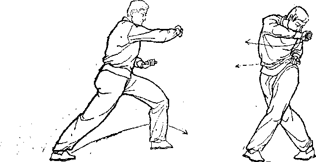①右脚经左脚后向左插步,体向右转,两臂位置不变(图 288)。②左脚向左后擦地撑蹬,右腿屈膝,成右弓步。右拳外 旋回拉,屈肘抱肋,拳心向上,左拳变掌内旋,向前拧钴推出成聋掌,掌心向前下。拧腰顺肩,以助其力。面向西南,目视西南(图289 )。