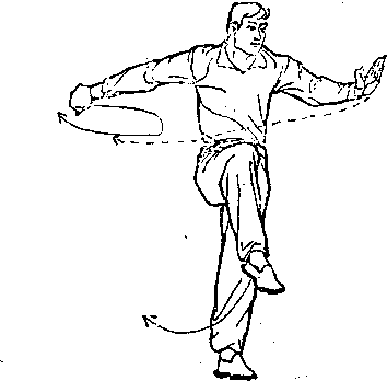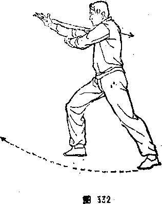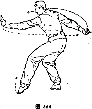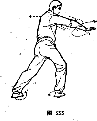 ①左鼸屈滕挺起,右腿伸直。同时,左手备拉变钩,右手 向怀里搂肘带手〈图“5 )。②右脚踏跳,左脚落地支撑,方腿 屈膝提起。右手盘肘后拉变钩手,左手向怀里搂射带手(图336), 田35 图336 ⑧左脚踏珧,右脚落地伸直,左脾向前上步,左腿屈膝成左弓 步左手向怀里撤搂,随即向前打出,成柱子手(图337 )。