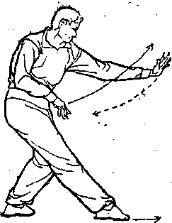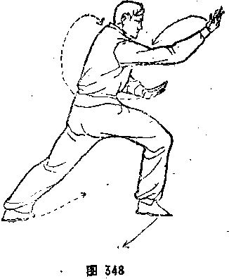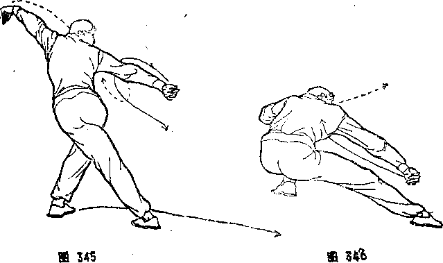 . ①右腿向右伸直,左腿屈膝全蹲,成仆步。左钩手变掌,左膂向右下外旋屈肘;右臂外旋,鹿肘回收,右钩手从左臂外上方 内旋,再由左向右平划,钩尖向后。目视右下方(图346 )。②体向 .右转,重心升起,左腿屈膝,右腿伸直,成左坐步。右臂屈肘回 收,右肘靠肋,掌心向下随右臂屈肘,左掌向前拧钻而出,.掌 心向前下.(图347 )。③右臂外旋从左臂上顺心口方向向前上翻掌 甩出,右臂如弯似直,掌心向上;左掌回捋于腹前,掌心向下,左臂贴胸靠肋。同时,右脚前移,右腿屈膝,左腿蹬直,成右弓 步。体面向东,目视前方(图348 >。