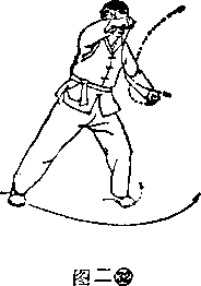 里钳摆,高与头齐.拳心朝下,拳面斜朝前;左拳由腰后向 外、向前、向里钳摆,高与腰齐.拳眼斜朝上。目视前下 方。(图二?)