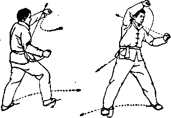 击法要点,我两拳右上左下时是向敌右太阳穴,左腰腹 部做钳状进击,若敌取右拳下格、左拳上挑动作破解时,我 速改为左上右下进攻敌之左太阳穴及右腰腹部