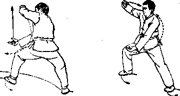动作要点:承“仙人摘桃”势,敌用拳击我头部,我左拳 架开.右手掏抓敌之裆部,敌若用左手下格我之右“掏裆