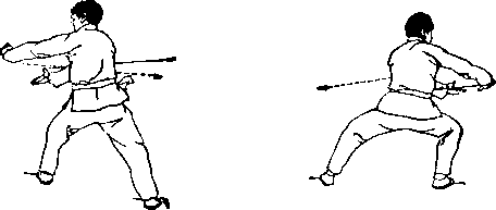 击法要点:在两面受敌时,用此式进行快速有力的左右 进击。(图三?)