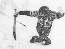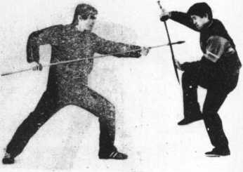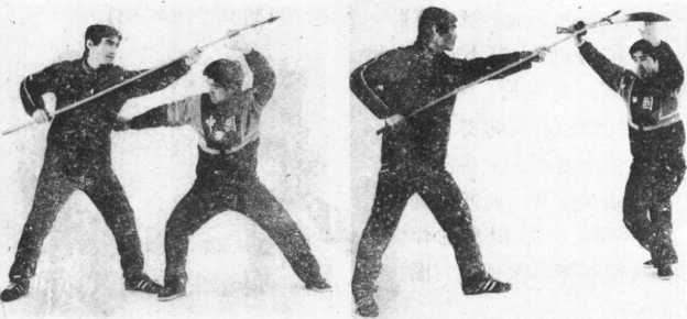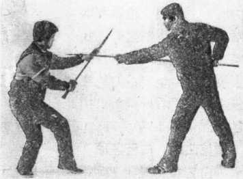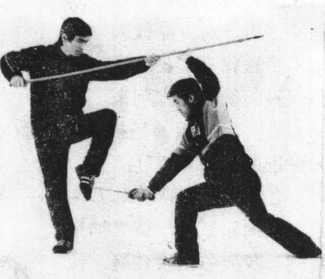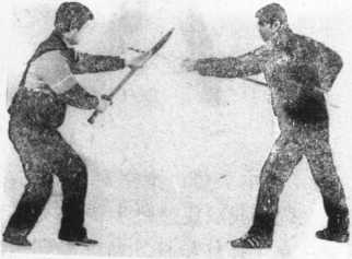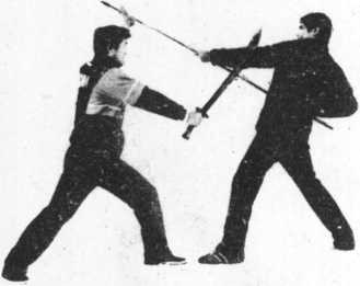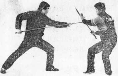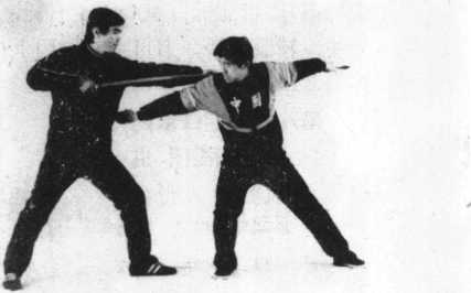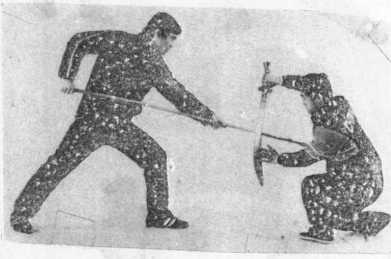 (二)躲过对方器 械,结合自己身法、步 法,用腰裆劲可以由上向 卜扎。如结合左手托刀背 可以棚架对方器械,乘势 提右腿进攻其腰部或后心 (图 490)。