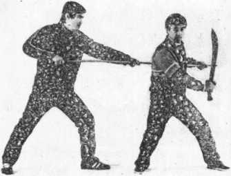 设对方刺我左膝,我应急撤左步,偷右步屈膝蹲,右手持 刀,左手按刀背,身体左转,向左下方推刀,避其枪头,顺枪杆 滑切对方手指(图485)。