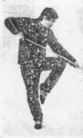 (二) 用低身法闪开刺来的器械,左手护头,右手持刀扫其 下盘'(图4一82)。