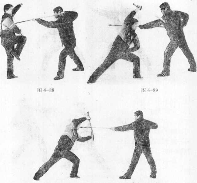 的器械。完全用的是裆、腰、手腕的旋转力。此势是向左滚闭, 闪身进刺(图4一77)。