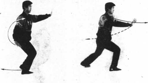 内劲:以腰为轴,劲由右腿移至左腿,随腰左转,缠至左 肩、肘:手,再逆缠后搌,右手逆缠前推。