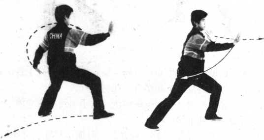 内劲:以腰为主宰,劲由左腿1合缠至右腿,腰劲上行,以 身法带动右手逆缠卜掲,左手逆缠前推。
