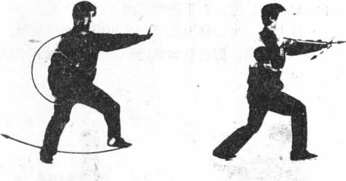 内劲:劲等右腿,左腿里缠倒步,右手由逆缠变顺缠,、向上 介1冇肩前,腰劲塌。