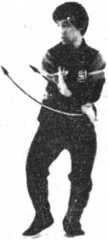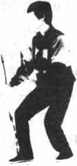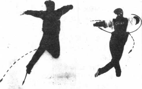 要求:此势为窜跳的过渡动作,右脚落地即起,用右脚前令 弹地蹬起前跃,此动先吸气后呼气,同下一个动作相连。