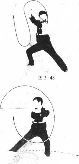 用法:脚步不动,剑随重心移动和身体旋转,在身体左右两
