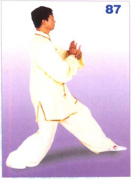 重心于右腿,成 坐步;随体转左掌屈臂平置于胸前, 掌心向内,掌指向右;右掌经耳侧 划弧搭于左手腕内侧,掌心向前, 掌指向上。眼随体转向前平视。 (图 87)