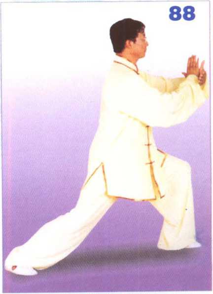 重心左移,左腿屈膝慢慢向前 弓出,成左弓步;双掌向前挤出, 腕与肩平,左掌心向内,掌指向右; 右掌心向前,掌指斜向上。眼向前 平视。(图88)