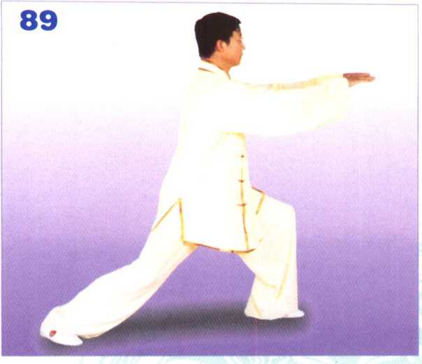 重心于左腿,成左弓 步;双掌向前伸展,右掌 从左掌上伸出,双掌转动 掌心向下,与肩同高。眼 向前平视。(图89) [动作要领】①上体正直, 松肩垂肘,顺腕舒指。② 双掌向前分开时,双肘微 屈。