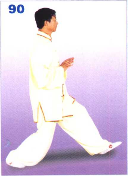 重心移于右腿,左腿屈膝身体 后坐,左脚尖翘起,成坐步;双掌 微向上划弧屈肘收于胸前,双掌心 向前下,掌指向上。眼向前平视。 (图 90)