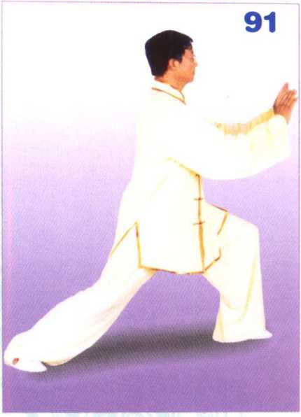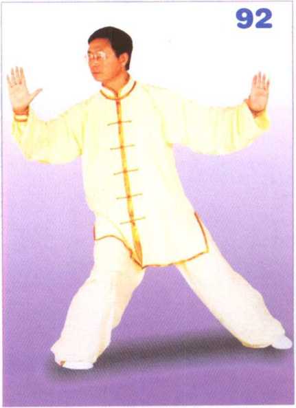 接上式,身体向右转,右腿屈 膝后坐,左脚尖内扣,随体转;双 掌开始向左右平撑,掌心向外,掌 指向上。眼向前平视。(图92) 【动作要领】①上体正直,松肩垂 肘,双臂保持弧形。②左脚尖内扣, 角度以90度为宜。