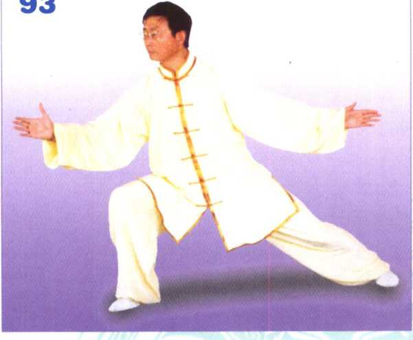 身体继续向右转,右 脚尖外展,重心移于右 腿,右腿屈弓,成右侧弓 步;右掌随体转向右平摆 划弧,与左掌成两臂侧平 举,腕与肩平,双掌心向 夕卜,掌指向体两侧。眼视 右掌方向。(图93) 【动作要领】①立身中正, 松腰沉髓,松肩垂肘,双 臂保持弧形。②右脚尖外 展,角度以45度为宜。