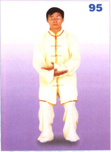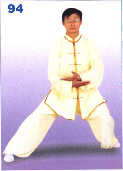 身体微向左转,重心移于左腿, 右脚尖内扣;双掌从身体两侧向腹前 划弧相合,左掌在上,双掌心向上,掌 指向左右。眼向前平视。(图94) 【动作要领】①立身中正,松腰沉 髓,松肩垂肘,双臂保持弧形。② 右脚尖内扣,角度以45度为宜。③ 转体幅度要适宜,重心平移要平缓, 双掌相合与重心移动要协调。