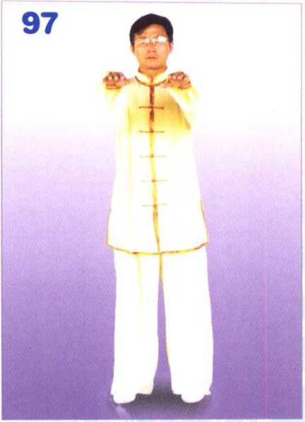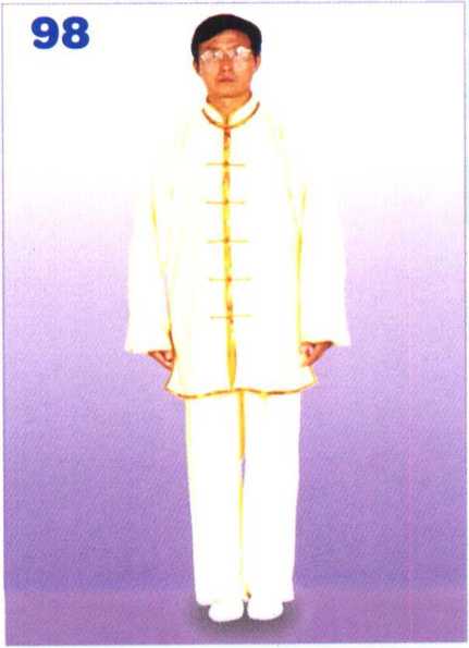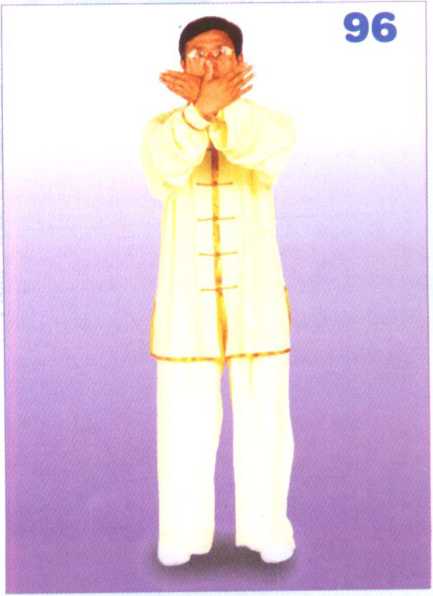 重心于左腿,右脚向左脚提收, 前脚掌先踏地,然后再全脚掌落地 踏实,脚尖向前,双脚与肩宽;同 时身体慢慢直立,双掌经腹前向上 提举,交叉合抱于胸前,右掌在外, 双掌心向内,掌指侧向上。眼向前 平视。(图95、96)