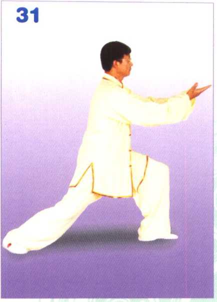 重心回移于左腿,左脚全脚掌 踏实,左腿屈膝慢慢向前弓出,成 左弓步;双掌同时向前按出,掌心 向前,掌指向上,与胸平。眼向前 平视。(图33)