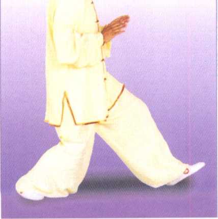 3232重心移于右腿,右腿屈膝,身 体后坐,左脚尖翘起,成坐步;两 臂屈肘回收,双掌边翻转掌心向下, 边沿弧线经胸前落于两肋前,掌心 斜向下,掌指斜向上。眼向前平视。 (图 32)